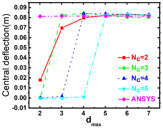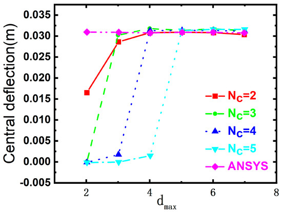 The central deflection of the clamped sinusoidally sandwich corrugated plate, F = 0.006 m, 10,317 discrete nodes.