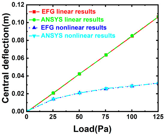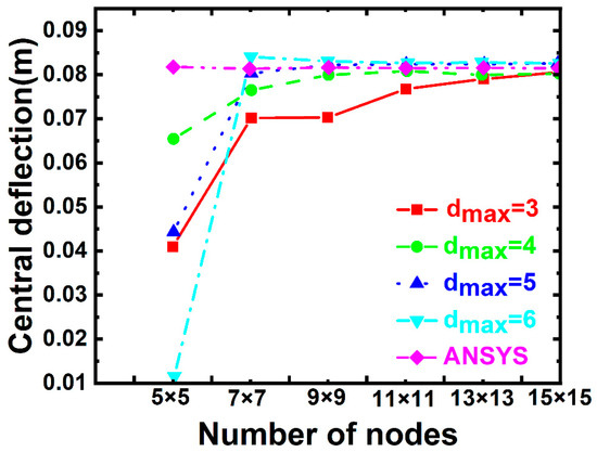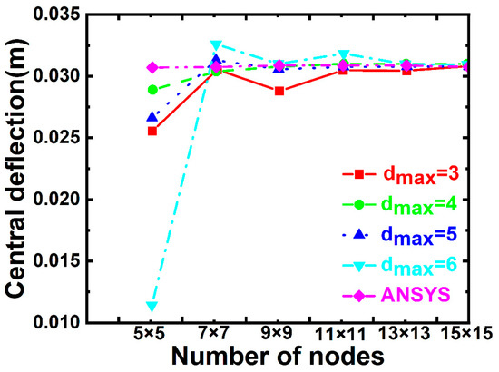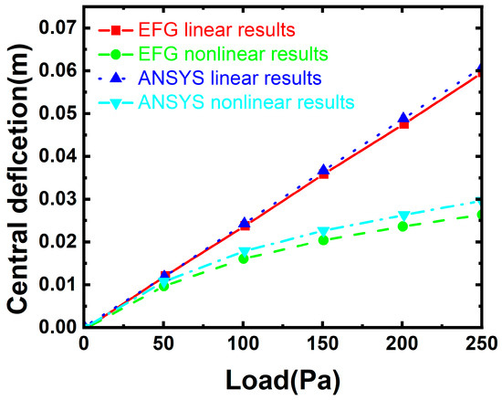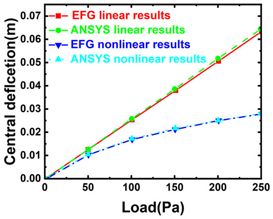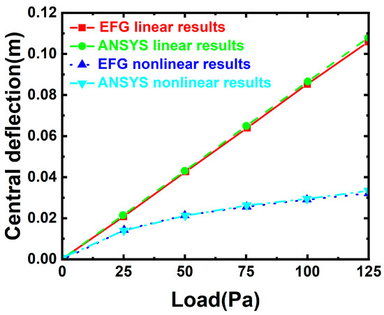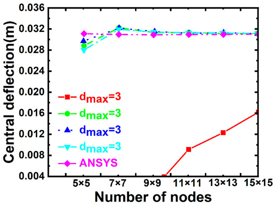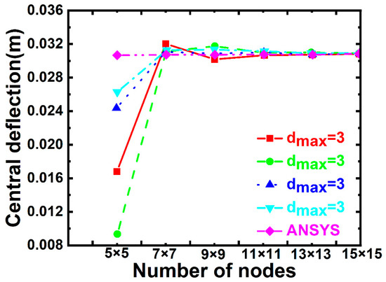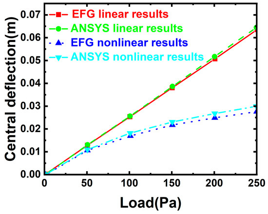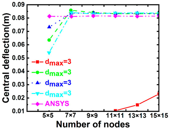 Example 1 and Example 2 show that the method used in this paper can achieve the results that satisfy the accuracy by using very few node discretizations, and the accuracy of the method of used in paper can be seen from the linear solution. When the plate is subjected to a load of more than 50 Pa, a more serious nonlinear phenomenon occurs with the increase in plate deflection; at this time, instead of continuing to apply the linear solution, as it is prone to large errors, it is appropriate to refer to the nonlinear solution. The finite element processing of nonlinear problems may appear as mesh distortion problems, and the larger the load generated by the larger deflection, the higher the likelihood of the occurrence of the above problems, so relative to the linear solution, the nonlinear solution’s error is larger, but within the scope of the engineering-allowable meshless method, the denser the nodes used, the more accurate the results obtained will be. When ANSYS finite element simulation was applied for a corrugated plate, that is, the corrugated plate was compared to an orthotropic plate of equal thickness via the method used in this paper and the finite element method using the same corrugated sandwich plate model, the four sides of the solid support results obtained by the comparative analysis of the accuracy of this paper’s method were verified.