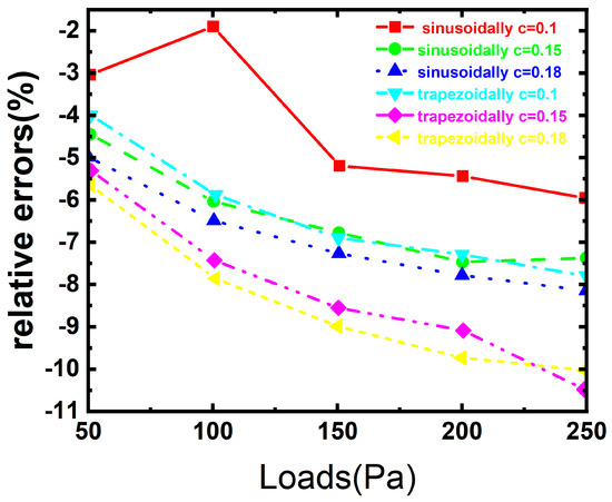 Nonlinear relative errors of sinusoidally and trapezoidally sandwich corrugate plates of different c values.