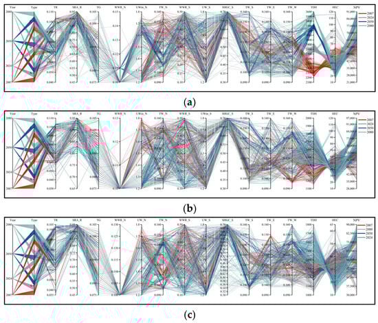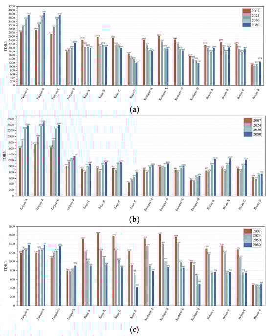 - The optimized exterior envelope parameters of regional folk houses’ optimal equilibrium solutions under 2050/2080 climate scenarios were simulated in the 2024 observational meteorological year model to quantify HEC, TDH, and NPV.