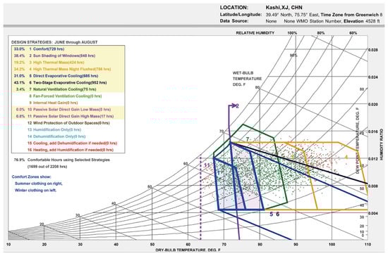 - Climate adaptability of folk houses: Rammed earth dwellings demonstrate optimal climate adaptability in most Xinjiang arid regions. Brick–concrete structures exhibit superior summer performance in extreme hot-arid zones, while brick–wood constructions require prioritized optimization due to their poorest performance.