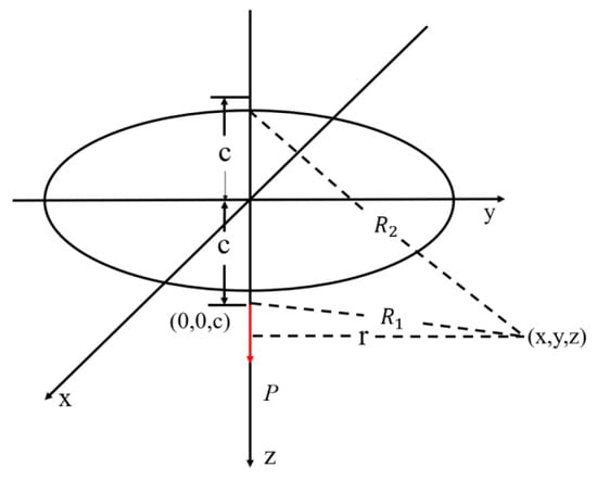 Assume that the rock and soil within the range of anchor cable action are linearly elastic, uniformly isotropic, and semi-infinite, and the anchor body is a linearly elastic body. The plane z = 0 is taken as the plane passing through the near end of the anchor body and perpendicular to the anchor rod. The anchor cable is assumed to deform compatibly with the surrounding rock and soil mass under applied stresses, and the grouting body of the anchored segment is assumed to maintain constant material properties throughout the loading process. Under the action of pre-stress loads in the semi-infinite rock mass, lateral frictional resistance is generated along the interface between the anchored segment and the surrounding medium. The following is given according to Equation (1), when x = y = z = 0:
