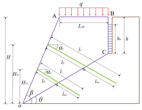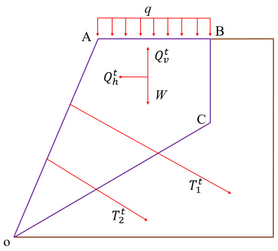Considering seismic loads, slope top overload, and anchor tension, the force state at a given time during the seismic time history is illustrated in Figure 5. Due to the small displacement relative to the length of the sliding surface, the reduction in the length of the sliding surface is not considered. Based on geometric relationships, the lengths of the sliding surface , the weight of the sliding block W, the length of the slope top load , and the slope top load Q are given by the following: