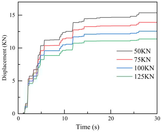 Figure 7 and Figure 8 illustrate the variation in anchor force over time for each initial anchor pre-stress under the dynamic force approach. In the traditional NSBM, the pre-stressed anchor force is assumed to remain constant during the calculation of the slope’s post-seismic displacement, potentially leading to inaccurate results. In contrast, the AMNB accounts for the progressive increase in anchor force as seismic displacement occurs, thereby offering enhanced resistance. Consequently, the AMNB method predicts relatively small post-seismic slope displacements, underscoring the effectiveness of the anchoring structure in mitigating seismic risks for reinforced slopes.