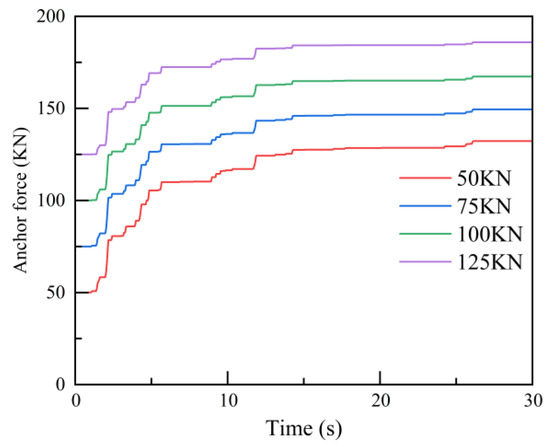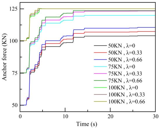 Figure 12 depicts the variation in anchor rod forces at different heights over time under the El-Centro seismic wave with varying ratios of , utilizing the AMNB method. During seismic activity, the slope experiences displacement, resulting in the elongation of the anchor rod. Consequently, the anchor rod force continuously increases with slope displacement, effectively restraining further slope deformation.