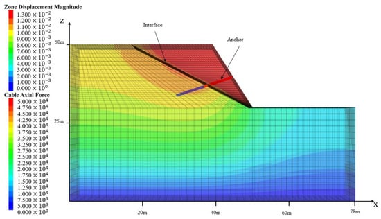 The final computed permanent displacement of the slope is illustrated in Figure 9. According to the contour plot, the slope experienced a displacement of approximately 13.504 mm along the structural surface. Under the same conditions, the calculated permanent displacements for the slope using the traditional Newmark method and AMNB method were 16.68 mm and 15.36 mm, respectively. It can be observed that the newly proposed AMNB method provides results more closely aligned with the numerical simulation results. However, it still overestimates the seismic permanent displacement of the reinforced slope by approximately 13.7%. This is because the proposed method assumes an infinite reverse yield acceleration coefficient, leading to smaller seismic permanent displacements of the slope due to significant reverse displacements during the seismic process. Nonetheless, this slight overestimation is acceptable in engineering practice and can enhance the safety margin of slope stability [10,29].