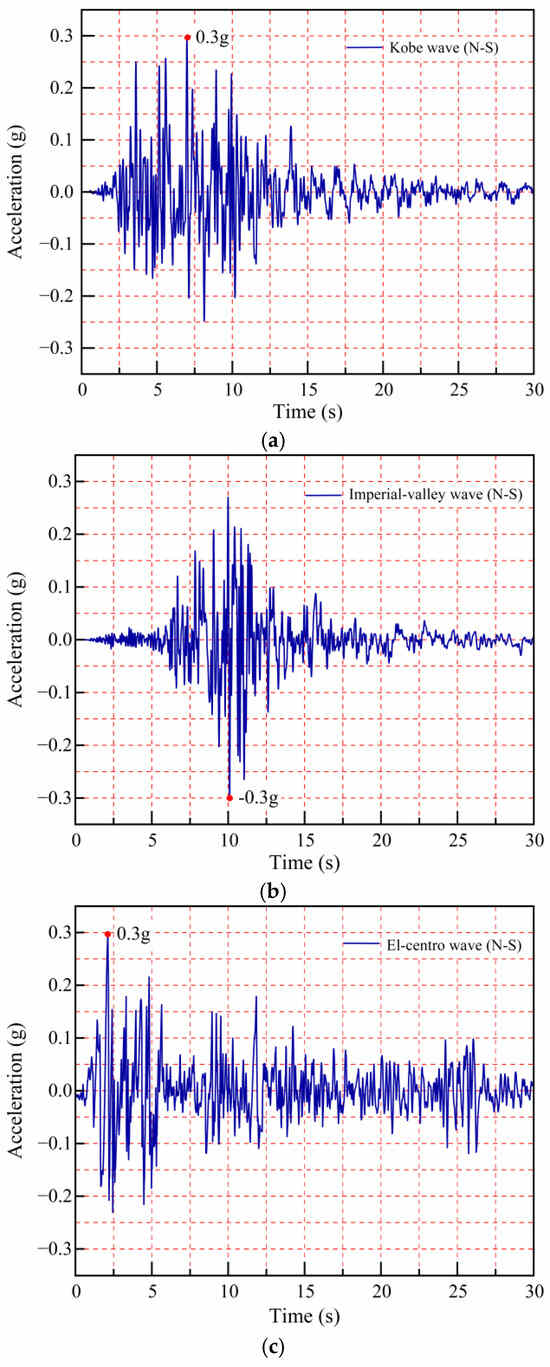 Acceleration time histories of seismic ground motions. (a) Kobe wave; (b) Imperial Valley wave; (c) El-Centro wave.