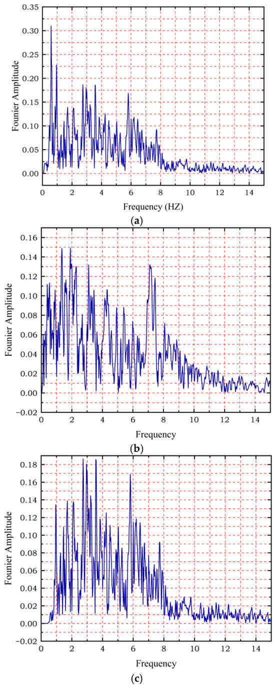 Fourier spectrum of seismic ground motions. (a) Kobe wave; (b) Imperial Valley wave; (c) El-Centro wave.