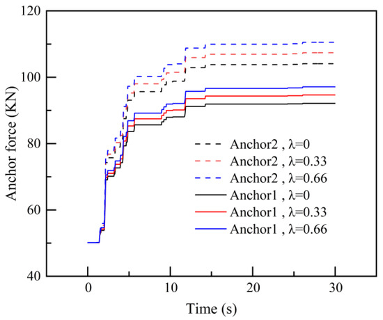 The initial pre-stress for both Anchor 1 and Anchor 2 is 50 kN. From the graph, it can be observed that when is 0, 0.33, and 0.66, the maximum axial force on Anchor 1 increases to 92.1 kN, 94.6 kN, and 97.1 kN during the seismic event. Similarly, for Anchor 2, the maximum axial force rises to 104.1 kN, 107.4 kN, and 110.6 kN. These data highlight the significant influence of vertical seismic motion on the maximum axial force of anchor rods supporting the slope. For example, with λ = 0, both Anchor 1 and Anchor 2 exhibit a similar increasing trend under seismic action, with growth rates of 84.2% and 108.2%, respectively. This indicates that the axial force in the lower anchor rod increases more rapidly than the upper anchor rod. The lower anchor rod at the bottom of the slope bears a greater tensile force during the seismic process, which aligns with findings from previous studies [8,37,38].