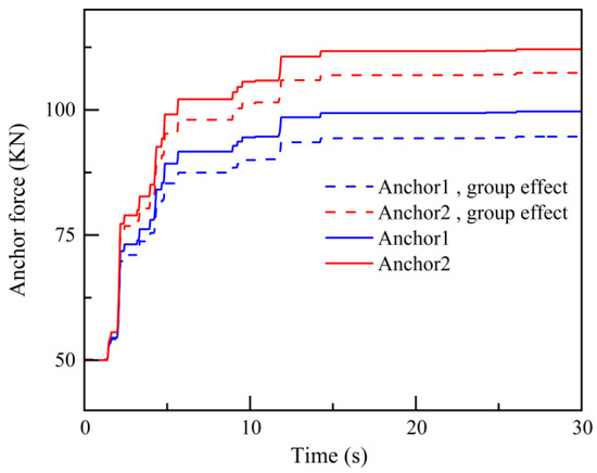 Figure 13 shows the variation in anchor axial forces under the influence of the El-Centro earthquake wave for different initial pre-stresses in Anchor 2. When the initial pre-stress is 50 KN, the axial force of the anchor continuously increases during the seismic process, peaking at 26.1 s. On the other hand, when the initial pre-stress is 100 KN, the axial force reaches its peak at 4.4 s. This difference arises because, with an initial pre-stress of 50 kN, the axial force continues to rise throughout the seismic process but does not reach the maximum pull-out force of the anchor by the end of the earthquake. Conversely, with an initial pre-stress of 100 kN, the axial force reaches the maximum pull-out capacity during the seismic event, and thereafter, the axial force remains constant. Figure 14 illustrates the influence of group anchor effects on the variation in anchor rod axial forces when λ = 0.33. From the graph, it can be observed that the maximum anchoring forces in Anchor 1 and Anchor 2 decrease by 5.1% and 4.6%, respectively, due to the impact of group anchor effects. This indicates that group anchor effects are significant and should not be overlooked in the stability analysis of slopes. These findings demonstrate that neglecting the influence of the maximum axial force and group effect on anchor bolts in slope stability results in non-conservative stability assessments, potentially compromising the safety of practical engineering projects.