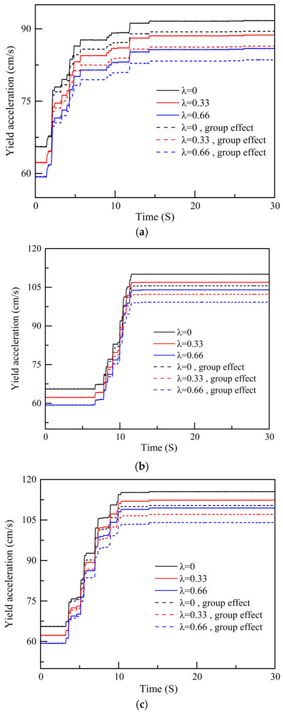Additionally, it can be observed from the graph that vertical seismic acceleration significantly impacts the magnitude of dynamic yield acceleration. When considering group anchor effects, the maximum dynamic yield accelerations under El-Centro seismic motion for values of 0, 0.33, and 0.66 are 88.8 cm/s2, 85.8 cm/s2, and 83.0 cm/s2, respectively. Similarly, under Imperial Valley seismic motion, the values are 59.9 cm/s2, 63.1 cm/s2, and 66.0 cm/s2, and under Kobe seismic motion, the values are 67.2 cm/s2, 70.9 cm/s2, and 74.1 cm/s2. Therefore, the presence of vertical seismic acceleration is detrimental to slope stability, and as λ increases, the slope yield acceleration decreases. Hence, the influence of vertical seismic acceleration on slope stability should not be ignored in design, consistent with previous research findings [10]. In summary, the presence of anchor rod support enhances the dynamic yield acceleration of the slope; the existence of group anchor effects and vertical seismic acceleration results in a reduction in the slope yield acceleration, adversely affecting slope stability.