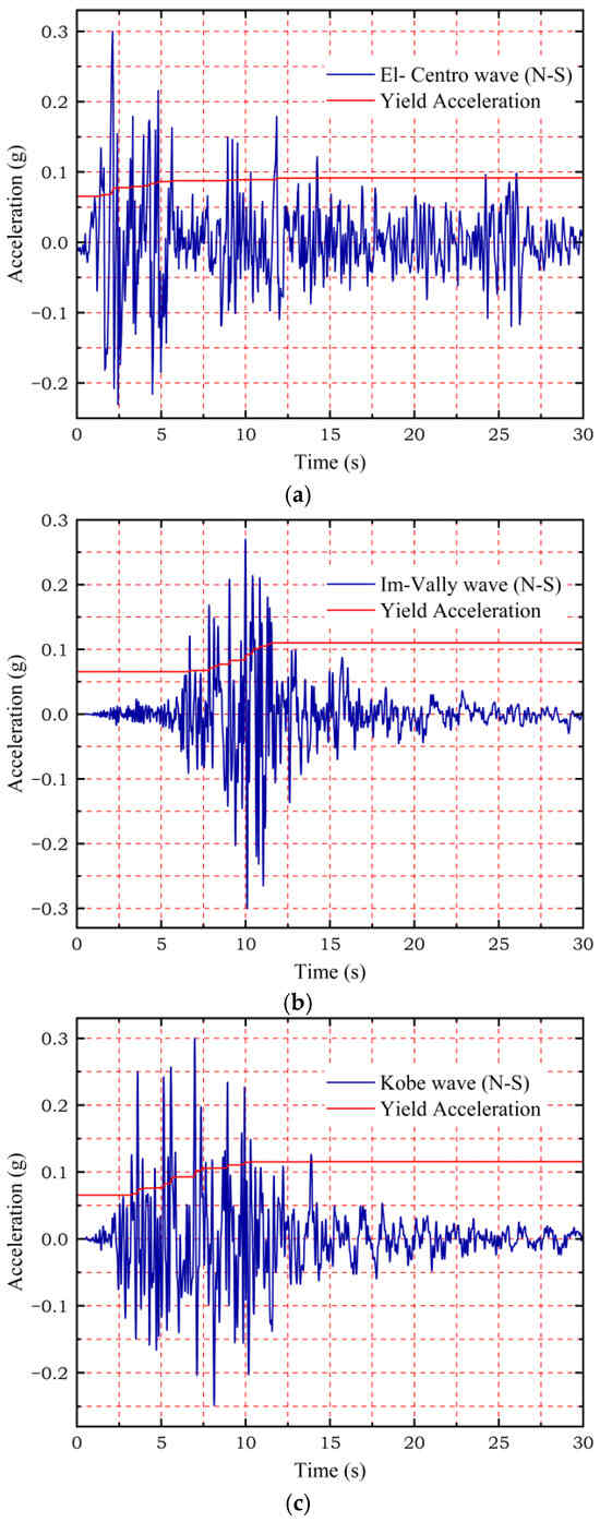 Variation in dynamic yield acceleration with seismic ground motions. (a) El-Centro; (b) Imperial Valley; (c) Kobe.