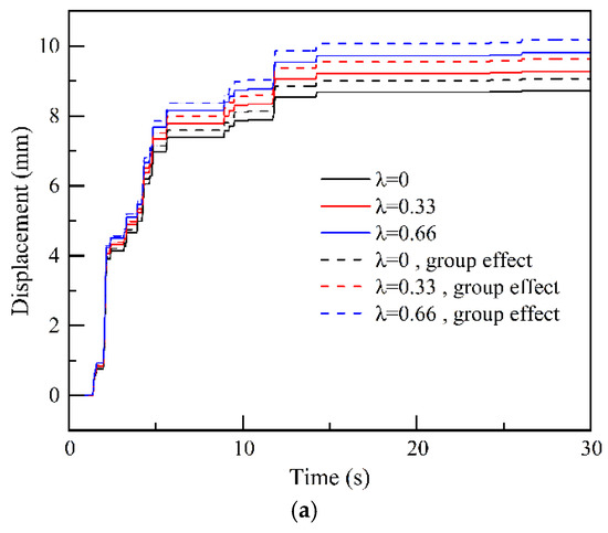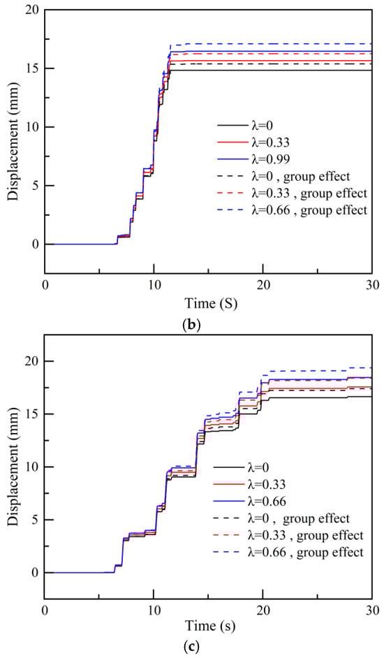 From the figure, it is also evident that the horizontal seismic permanent displacement is related to the duration of seismic motion, and the seismic permanent displacement of the slope is 5~10% larger when considering group anchor effects. Using = 0.33 as an example, under El-Centro, Kobe, and Imperial Valley seismic actions, considering group anchor effects increases the slope’s seismic permanent displacement by 0.3 mm, 1.1 mm, and 0.6 mm, respectively. This also indicates that the presence of group anchor effects is detrimental to the stability of the slope supported by anchor rods. Similarly, the presence of vertical seismic acceleration increases the seismic permanent displacement of the slope. For instance, when considering group anchor effects under El-Centro seismic motion, the seismic permanent displacement increases by 0.56 mm and 1.11 mm for = 0.33 and 0.66, respectively, compared to = 0.