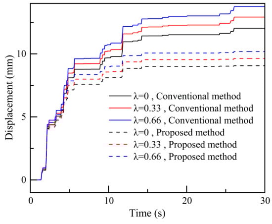 Additionally, to investigate the impact of dynamic yield acceleration on the slope’s permanent displacement, Figure 18 compares the horizontal seismic permanent displacement results determined by the proposed method and the conventional method under the El-Centro seismic action. In the conventional method, a constant yield acceleration is used to calculate the horizontal seismic permanent displacement, with fixed values of 65.6 cm/s2, 62.3 cm/s2, and 11.446 cm/s2 for = 0, 0.33, and 0.66, respectively. In contrast, under the same conditions, the maximum dynamic yield acceleration determined by the anchor rod force-corrected Newmark method is 92.1 cm/s2 (refer to Figure 16a). It is evident that the horizontal seismic permanent displacement determined using the dynamic yield acceleration method is significantly smaller than that calculated by the conventional method. For instance, at = 0, the final slope’s seismic permanent displacement calculated by the anchor rod force-corrected method is 9.1 mm, while the conventional method calculates a final slope’s seismic permanent displacement of 12.1 mm. This indicates that the substantial increase in dynamic yield acceleration during the seismic process, due to anchor rod forces, significantly reduces the slope’s seismic permanent displacement. Consequently, this suggests that the traditional NSBM is conservative when calculating the displacement of bolt-supported slopes.