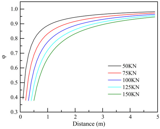 According to the conclusions drawn from the Mindlin solution theory, the group anchor effect coefficient can be calculated for different anchor spacings and anchor pre-stressed forces. Figure 19 illustrates the variation in the group anchor effect coefficient for an anchor rod with a force of 50 KN, considering different forces and spacings for surrounding single anchors.