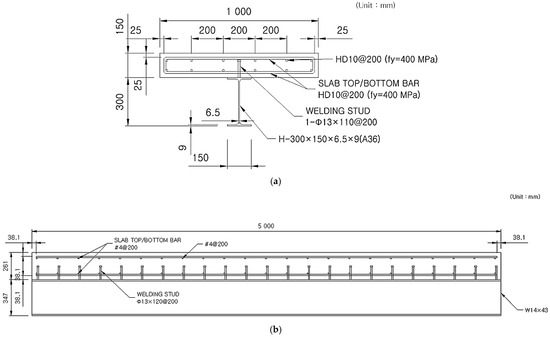 Structural details of the test specimen (T-beam configuration). (a) Longitudinal section of the test specimen; (b) Cross-sectional view of the test specimen.