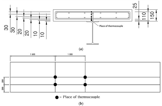 Thermocouple placement for temperature measurement in the composite beam specimen. (a) Thermocouple positions in the beam cross-section, indicating depth locations (mm); (b) Thermocouple placement on the slab portion of the composite beam specimen.