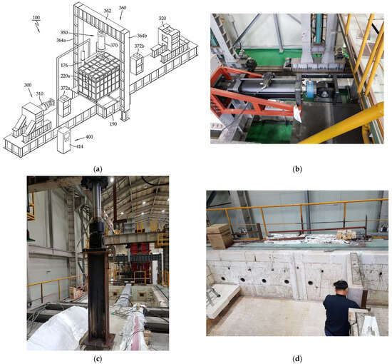 Experimental setup for axial restraint testing. (a) Schematic diagram of the furnace used for axial restraint fire testing; (b) Actuator system for axial restraint force; (c) Actuator system for vertical force; (d) Heating furnace.