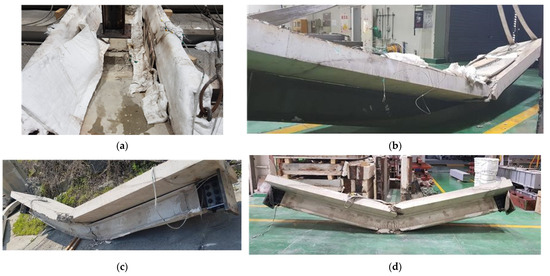 Photographs of specimens after testing. (a) Specimen 1 after testing (load ratio: 70%, 27 min); (b) Specimen 2 after testing (load ratio: 50%, 58 min); (c) Specimen 3 after testing (load ratio: 70%, 20 mm coating, 131 min); (d) Specimen 4 after testing (load ratio: 70%, 10 mm coating, 73 min).