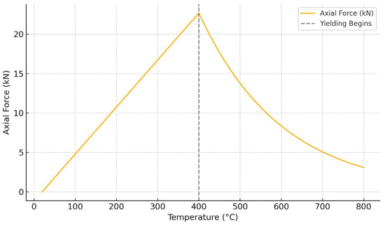 Axial force—temperature graph for an axially restrained beam. After reaching a certain temperature (approximately 400 °C), the beam begins to yield or undergo stiffness degradation. At this point, the axial force no longer increases and instead begins to decline, as the beam can no longer sustain high compressive forces.