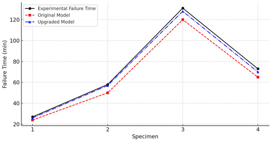 All failure time values computed from the original and upgraded analytical models have been verified for accuracy. The error percentages (difference between predicted and experimental failure times, as a percentage of the experimental time) have been recalculated to ensure correctness. Table 1 below summarizes the experimental failure times of each specimen alongside the predictions from both the original model and the upgraded model, with the corresponding error percentages for each model.
