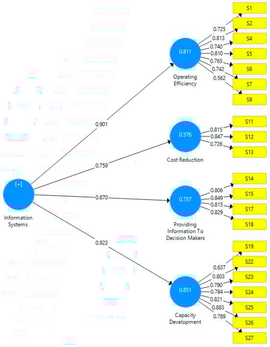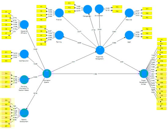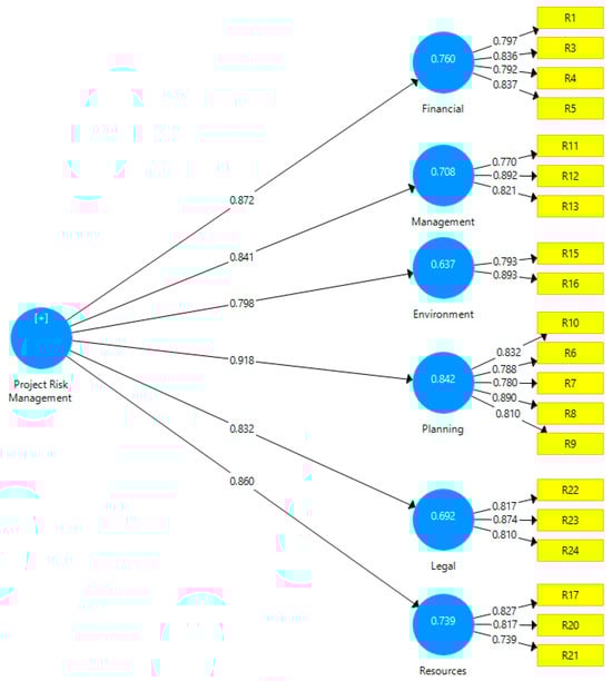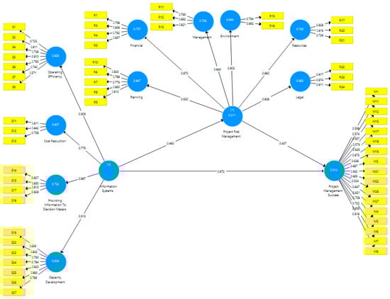 The validity and dependability of the surveys were then evaluated. Several responders validated the surveys’ superficial validity. The content validity was confirmed by the assessments performed by several academic and industrial experts. Because the project management success questionnaire is standard and has been utilized numerous times, there was no need for a confirmatory factor analysis type of construct validity. Instead, confirmatory factor analysis was only used to determine the construct validity of the information systems and project risk management questionnaires in SmartPLS 4.0 software. Figure 1 displays the factor loadings associated with the various items of information systems, whereas Figure 2 displays the factor loadings related to the variable items of project risk management. Each item’s factor loadings greater than or equal to 0.5 suggest a solid structure. According to Hair Jr. et al. [], validation of the measurement model’s suitability with a factor that loads greater than 0.5 requires keeping items with a load greater than 0.5 in the model. Items with factor loadings less than 0.5 are removed from the model and are not used in the process of analysis. Cronbach’s alpha coefficient was used to estimate the reliability of questionnaires for the information systems questionnaire as 0.916, project management success as 0.960, and project risk management as 0.927. Then, descriptive statistics were used to analyze the demographic variables of the research, and inferential statistics were used to analyze the data using a structural equation model, simple regression, and multiple regression using a step-by-step procedure in SPSS and Smart PLS software. Table 1 provides a summary of the demographics of the respondents, who were mostly site engineers (34.7%) and project managers (25.3%), with 51.6% working in the government sector and 38.9% in contracting firms; all had expertise with PM. In total, 80% of respondents are male, and 45.2% have more than ten years of experience. Finally, the respondents reported holding graduate or postgraduate degrees.