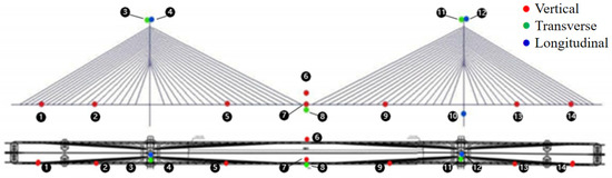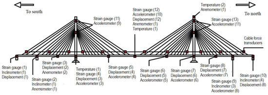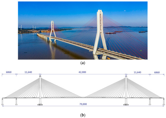 With the development of transportation infrastructure in China, cable-stayed bridges have become a major structural type for long-span bridges crossing rivers and roads [1]. Compared with traditional continuous beam bridges, the cable-stayed bridge is greatly reduced in size and the number of piers owing to the elastic supports offered by the cables, and its spanning capacity is then improved significantly. In comparison with suspension bridges, cable-stayed bridges exhibit better wind-resistance stability due to their greater lateral stiffness. Additionally, they do not require massive cable anchors. However, the performance of the cable-stayed bridge in service needs further investigation to ensure its safe operation over its lifetime. Dynamic characteristics are a fundamental consideration for the safe operation of long-span cable-stayed bridges, but these characteristics are susceptible to degradation over time in service [2]. Therefore, an SHM system is necessary to monitor the performance of the structure for safe operation [3,4].