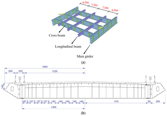 As indicated in Figure 2, the main bridge deck structure is composed of concrete deck over prefabricated steel frames. The steel frame consists of two separated steel I-section main girders, cross beams and secondary longitudinal beams, as shown in Figure 2a, which are assembled by joint plates and high-strength bolts. The two main girders are 26 m in length and are connected by cross beams. Three secondary longitudinal beams are installed between the two main girders, with spacings of 6 m, 7 m, and 7 m, respectively, followed by a final 6 m spacing. Low-shrinkage cast-in situ concrete is placed on the upper surface of the steel frame to form a steel–concrete composite bridge deck structure, as illustrated in Figure 2b.