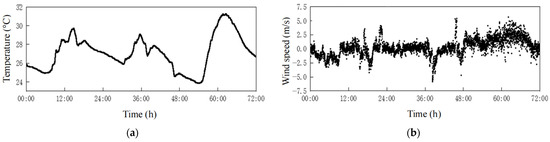 The results of the SHM measurements of environmental quantities (e.g., ambient air temperature and lateral wind speed) and structural responses (e.g., cable force and bridge main girder deflection) of the bridge, which were recorded from 0:00 on 4 June to 24:00 on 7 June 2020, are provided in Figure 4. From the results, the temperature monitored at the midpoint of the main span changes over time on a daily basis, with the highest value around 2:00 p.m. and the lowest value around 6:00 a.m., as depicted in Figure 4a. The lateral wind speed varies randomly over time, with the highest values of 5.0 m/s in both the east and west directions, as shown in Figure 4b.