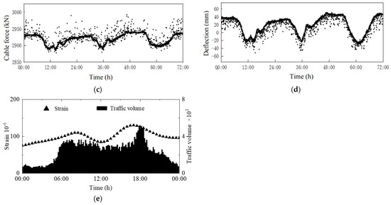 Figure 4c gives the SHM measurements for the cable force time history measured at CS01-01 on the cable connecting the main span bridge deck closest to the south bridge tower with the shortest length. From the results, the cable force varies over time, generally on a daily basis, with the highest value of approximately 3000 kN. Figure 4d presents the deflection time history recorded at HS005-01, a critical place in the bridge main span. The results indicate that the deflection varies over time within the range of −50 mm to 50 mm in a similar pattern to that of the cable force, which is mainly caused by the volume of traffic on a daily basis. Figure 4e presents the correlation between the WIM data and strain gauge data. The results show that as traffic volume increases, the amplitude of structural strain also increases accordingly. This demonstrates the significant impact of traffic loading on structural behaviour, which is crucial for understanding the in-service performance of the bridge.
