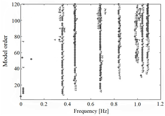 The SSI method, a time-domain approach, is widely utilized to extract modal properties from vibration data measurements. Typically, there are two techniques, i.e., data-driven SSI and covariance-driven SSI. In this study, the data-driven SSI method was adopted for extracting the natural frequencies of the bridge on the basis of the stabilization diagram, as shown in Figure 8. In the modal parameter extraction process, the maximum model order was set to 120, with a number of block rows of 80. The filtered stabilization diagram was then obtained in the low-frequency range below 1.2 Hz.