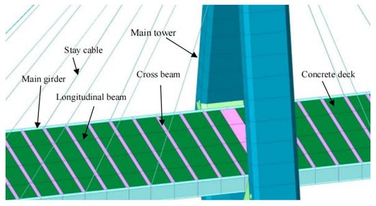 On the basis of the design information, the geometric properties of the structural members and non-structural components of the bridge, including the dimensions of the girders, beams, towers and cables, are obtained, which can be utilized to construct the FE model. The material properties for each structural member of the cable-stayed bridge are initially estimated from the design, construction and maintenance data, as summarized in Table 4. For example, the elastic modulus of concrete materials can be estimated from the concrete compressive strength by using the existing relation between the concrete elastic modulus and compressive strength, which should be verified by field tests.
