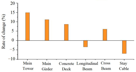 The updated stiffness parameters of the FE model for the cable-stayed bridge are illustrated in Figure 12, by utilizing data from eight measured frequencies. The results show that the stiffness updating parameters, which reflect the change rate of stiffness for each structural member group, range from −7.14% and 14.88%, with an average absolute value of 8.59%.