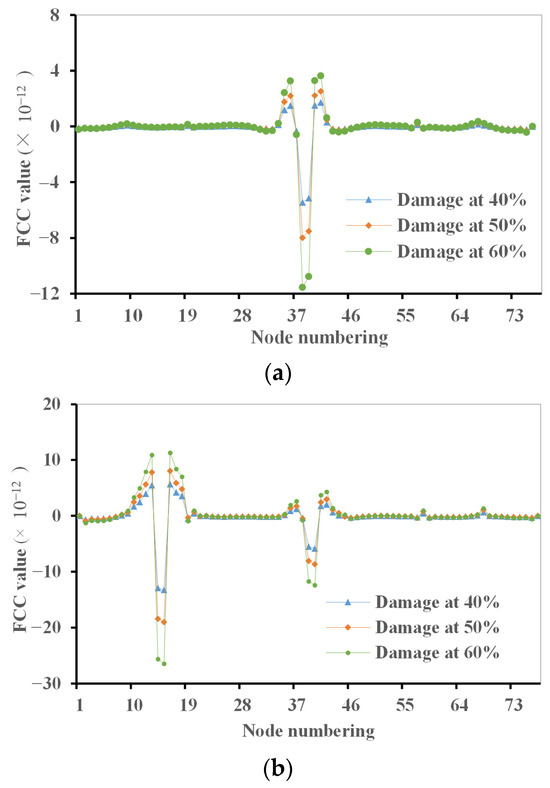 Figure 15 presents the results of the inverse damage identification from the FCC method, where two simulated damage scenarios with various damage extents are considered. A total of the first three modes of the damaged structure are utilized for calculating the FCC damage index. For the case with a single aspect of damage in the centre of the main span at segment 39, the results in Figure 15a show significant FCC damage index changes at nodes 39 and 40 of segment 39, and these changes are more obvious for the cases with higher damage extents, indicating that the single aspect of damage is correctly identified by the FCC method.