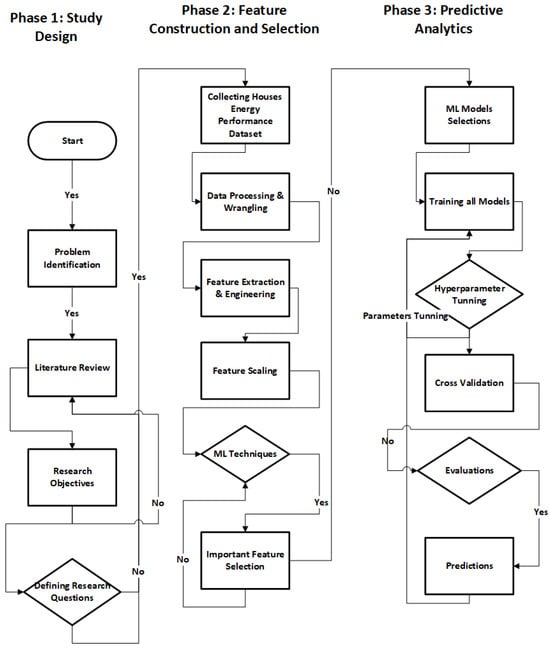 The global energy consumption from buildings, particularly residential structures, is increasing. Enhancing energy efficiency in this sector is vital for advancing sustainability and improving quality of life [,]. Energy efficiency rating measurement is a critical component in assessing the energy performance of residential buildings. Ratings provide information in a manner that enables homeowners, policymakers, and other stakeholders to make well-informed decisions. The UK has employed several techniques to provide uniform procedures for measuring and reporting energy efficiency in residential buildings throughout time [,,,]. Energy-efficient buildings offer enhanced comfort and a better health environment for those within such households. Modern HVAC systems and enhanced insulation provide sustainable indoor temperatures with better air quality []. This literature review examines the primary techniques and frameworks implemented to predict energy efficiency in buildings, specifically emphasising feature selection techniques and machine learning models.