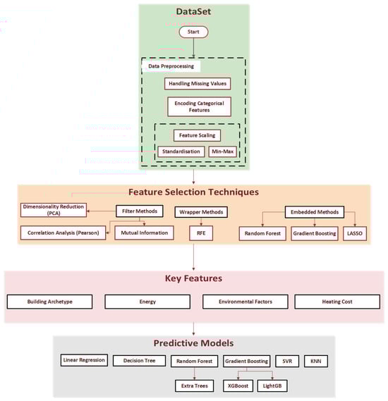 The implementation of energy-saving improvements in residential buildings achieves significant economic benefits by reducing utility bills and minimising the emissions footprint [,]. Lower energy consumption rates reduce the cost of living and decrease energy stress on grid loads []. Conventional approaches often fall short of addressing energy efficiency in buildings, possessing several dynamic and complex sets of features []. Traditional methods typically rely on linear assumptions and simplified interactions, which can overlook critical non-linear relationships and complex feature interactions inherent in large datasets. These challenges require advanced machine learning techniques to uncover correlations and hidden patterns within energy performance data [,,]. In contrast to traditional methods, machine learning algorithms are capable of modelling non-linear dependencies and complex feature interactions, thereby providing more accurate and robust predictions. Therefore, the implementation of machine learning models in energy efficiency prediction can enhance the effectiveness of energy resource allocation []. However, the highly complex interactions of the features within buildings can make the measurement process challenging []. Hence, this demands the use of advanced and intricate analytical techniques. Combining machine learning with feature selection together provides very high promises for further improvements in the accuracy and robustness of energy efficiency prediction methods for residential buildings [,]. These powerful techniques can mine hidden patterns, model complex interactions, and adapt to changing conditions. Advanced analytics with advanced ML algorithms can play a significant role in achieving objectives for energy efficiency and sustainability []. Machine learning techniques have been employed to work effectively when energy data have complex dependencies [,]. Prediction models are capable of predicting energy efficiency by identifying gaps within residential feature performance. Predictive models provide effective design and retrofit strategies to improve the energy performance of buildings [].