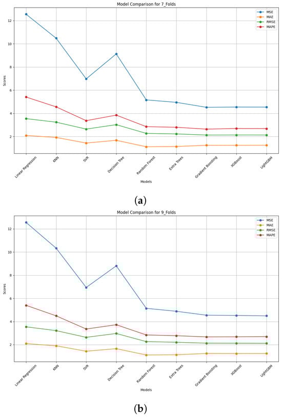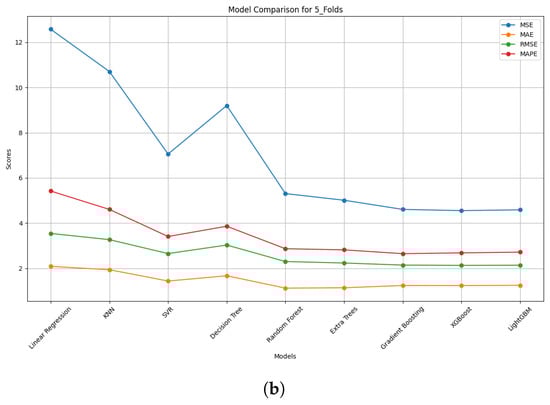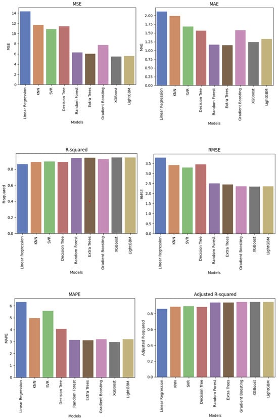 Machine learning algorithms have been extensively employed in predicting energy consumption and evaluating the energy performance of buildings. The following are published studies that have utilised machine learning techniques. The authors of [] employed Linear Regression to assess the impact of various building features on energy performance. In refs. [,], where residential energy consumption was predicted using KNN for the construction of historical energy usage and characteristic patterns, especially when the dataset included complex and irregular structures. A similar piece of work [] on predicting energy-saving using retrofit measures in residential buildings, as well as an energy consumption dataset with two different cases of before and after retrofit energy usage, correctly showed KNN to be suitable for predicting energy-saving potential states from different retrofit interventions. SVR was employed in [] to model energy performance in residential buildings under heterogeneous data features driving each building, linked to meteorological conditions, building materials, and occupancy patterns. Another study [] used Decision Tree to predict energy consumption to enhance energy efficiency within buildings. The numerical statement in this research stated historical energy consumption data and building characteristic data, whereby Decision Tree can predict critical energy-saving areas effectively. Ref. [] demonstrated that Random Forest performs well in energy consumption prediction tasks based on information about building size, insulation type, and patterns of occupancy. They revealed that RF could capture the complex relationships between input features and the energy applications needed for accurate energy use prediction. Similarly, the authors of [] used RF to predict energy demand using historical consumption data and the building characteristics in the dataset. Gradient Boosting in [] was used to predict commercial buildings’ energy consumption by considering a building’s design, occupancy pattern, and weather conditions. A conclusion was drawn that Gradient Boosting establishes better forecasting accuracy than other approaches available to date in this field.