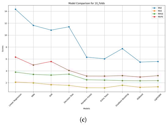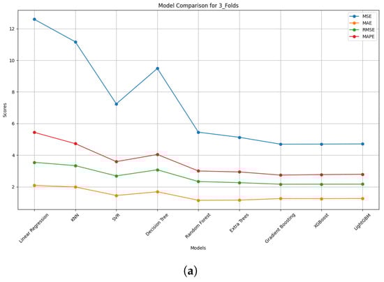 There are published studies comparing the prediction performances of various machine learning models in the Table 1. Comparative analysis studies on multiple machine learning algorithms relating to the prediction of energy performance have been published [,]. Ref. [] introduced three machine learning-based prediction frameworks that aim to anticipate several energy loads simultaneously. Ref. [] presents a comprehensive analysis of the four primary machine learning techniques used in forecasting and enhancing building energy performance: artificial neural networks, Support Vector Machines, Gaussian-based regressions, and clustering. Ref. [] introduced a range of machine learning approaches that can improve the accuracy and efficiency of energy models by thoroughly demonstrating the construction of energy models utilising extreme Gradient Boosting (XGBoost), artificial neural network (ANN), and degree-day-based ordinary least square regression. Ref. [] presents a taxonomy of the predominant machine learning techniques employed for predicting energy consumption, which were based on the features of buildings. The study also offers a comparative examination of several ML algorithms in terms of how they contribute to predicting energy use.