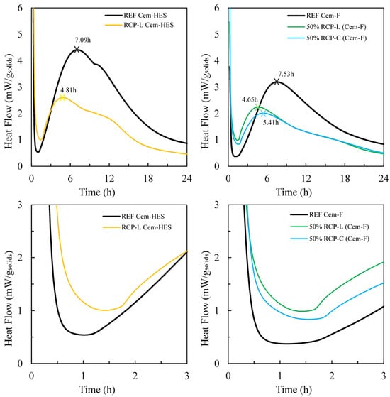 - The use of both recycled powders affected the hydration of cement pastes by increasing heat release at the induction period and shifting the acceleration phase to earlier hours due to a filler effect. However, the two powders did not contribute fully to the hydration as a much lower heat emitted at 7 days by pastes with RCP is observed.