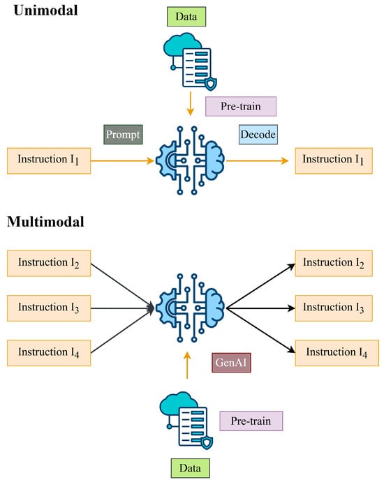 Unimodal and multimodal generative models represent different approaches in GenAI [], principally differentiated by the type and variety of content they produce or analyze. Unimodal generative models, such as GPT for text and StyleGAN for images, focus on the production and understanding of data within a singular modality. In contrast, multimodal generative models like DALL-E and CLIP can process and integrate various data types, such as text and images, facilitating cross-modal functionalities, such as generating images from textual descriptions or comprehending relationships between visual and textual content. Figure 1 presents a comprehensive examination of the distinct methodologies employed in GenAI.