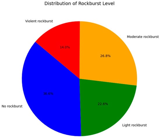 Prompt 3. Please create a pie chart to analyze the distribution of intensity levels in the dataset. Replace the: “0” with “No rockburst”, “1” with “Light rockburst”, “2” with “Moderate rockburst”, and “3” with “Violent rockburst” in the pie chart.
