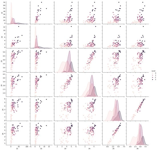 Prompt 4. Please plot the pairwise relationships between the Z1, Z2, Z3, Z4, Z5, and Z6 and “Level”.
