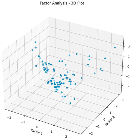 Factor analysis (FA) is a widely used statistical method in data preprocessing aimed at reducing dimensionality. It is a complex technique that reduces a large volume of data into a smaller set of factors by grouping related parameters into meaningful constructs []. In FA, factors represent a range of variables whose cross-correlation helps minimize the overall variance. The rotation process in FA assumes that each factor could explain the relationship between different sets of variables [].