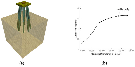 In FLAC3D, the equilibrium state refers to a steady condition where forces and strains in the system no longer change, meaning there is no further displacement or stress variation. The equilibrium state in the simulation typically indicates the stability and convergence of the model during computation. In this paper, we use the equilibrium state to represent mesh convergence. Mesh convergence refers to the process whereby simulation results, such as stress and displacement, stabilize as the mesh size (number of elements) is progressively refined. When the mesh is refined, the computational results converge to a fixed value. Under this condition, the model is considered to converge effectively. The accuracy of the results improves because of this convergence. Displacement is recorded for each grid size during simulations with different grid divisions. The grid count is divided into five groups, ranging from 14,000 to 84,000 with intervals of 14,000, at an embedment depth of 15 m and an inclination angle of 8 degrees. The results are presented in Figure 3.