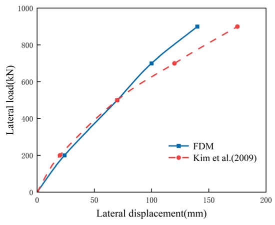 To verify the activity of our Finite Difference Method (FDM) FLAC3D, the response of load–displacement resulting from the numerical model is compared with the results in the available literature. The results were compared. Kim et al. [32] reported on field tests of steel pipe piles under lateral loads installed at the Incheon Bridge site in South Korea. The pipe piles had an outer diameter of 1.016 m and a wall thickness of 16 mm. The bending stiffness of the pile section was 1,260,000 kN·m2. Each pile was driven using an oil pressure hammer and a 1.0 m-long pile head remained above the ground surface. The final depth of the driven piles was recorded as 25.6 m. The mapped local geology is that of a marine deposit. The lateral load was applied at a point 0.5 m above the ground surface and increased substantially up to a maximum load of 900 kN. Figure 4 shows the comparison of the pile head deflection versus lateral load curves derived from the field testing and computed by the presented method. Reasonable agreement with testing results has been achieved by the present model under likely working conditions. Thus, the lateral response loading of offshore piles can be investigated = using this model.