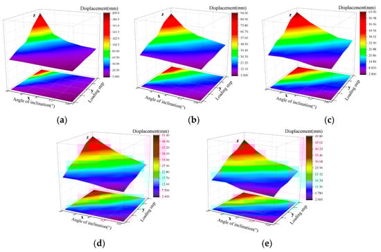 Figure 5 shows the displacement contour of HRPG over a range of embedment depths from 9 m to 21 m. It is a three-dimensional Cartesian coordinate system. As shown in Figure 3, the X-axis is the incline angle, the Y-axis is the loading step, and the Z-axis is the lateral displacement of the pile cap. Usually, the pile cap has the maximum deformation. Figure 5a–e illustrates the maximum displacement of the HRPG for embedment depths of 9 m, 12 m, 15 m, 18 m, and 21 m. Here, “D” denotes the embedment depth of the pile foundation and “9” denotes depth. The analysis of the HRPG shows that increasing the pile inclination and the number of loading stages significantly reduces the displacement. For vertical piles in the fifth step of loading, the maximum displacements were 199.07 mm (D9) and 93.51 mm (D12), respectively. In contrast, for piles inclined at 16° in the first step of loading, the maximum displacement decreases sharply to 5.42 mm (D9) and 3.47 mm (D12). When the inclination was 4°, the displacement was again maintained at relatively high levels of 81.51 mm (D9) and 55.21 mm (D12). This result highlights a critical point: below 4° of inclination, the displacement decreased faster, while above 4° it decreased more slowly, and between 12° and 16° it slowed down further. Observations indicate that increasing the embedment depth from 9 m to 12 m consistently reduced pile head displacement. At the first step of loading, displacement decreased from 13.68 mm at an embedment depth of 9 m to 11.35 mm at 12 m; at the fifth step of loading, they decreased from 199.07 mm to 93.51 mm. Similar trends were observed for inclinations between 4° and 16°. Specifically, at the first step of loading, displacement was 12.78 mm at 9 m versus 11.11 mm at 12 m; at the second step, they increased to 22.06 mm (9 m) and 18.44 mm (12 m); and at the fifth step, displacement reached 81.51 mm at 9 m and 55.21 mm at 12 m. These findings indicate that deeper embedment enhances structural stiffness and improves resistance to deformation under higher loads. Observations indicate that the influence of pile inclination on displacement becomes more pronounced above 8°, reaching an optimum at 12°. For loads below 600 kN, minimal displacement is maintained; however, significant increases occur between the third and fifth steps of loading. At an embedment depth of 12 m, the displacement is approximately 50–75% of that at 9 m, suggesting that deeper embedment improves deformation resistance under large loads.