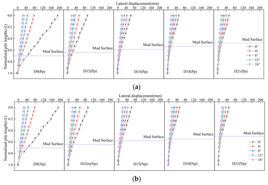 Transverse displacement at different inclination angles under transverse loading conditions. (a) Positive batter pile; (b) negative batter pile.