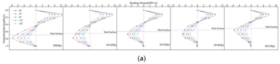 To investigate the effects of batter pile inclination on HRPG performance, the pile’s displacement and bending moment at a 15 m embedment depth were analyzed (see Figure 7 and Figure 8), revealing a systematic decrease as the inclination angle increased from 0° to 16°. For positive batter piles, the pile head displacement was 63.25 mm at 0°, decreasing systematically to 45.14 mm at 4°, 32.31 mm at 8°, 21.45 mm at 12°, and 19.54 mm at 16°. For negative batter piles, the displacement decreased systematically from 62.75 mm at 0° to 19.37 mm at 16°. In addition, the bending moment of positive batter piles decreased from −3.31 MN·m at 0° to −0.85 MN·m at 16°, while that of negative batter piles decreased from −2.9 MN·m at 0° to −0.45 MN·m at 16°, highlighting the efficiency of batter piles in mitigating internal forces.