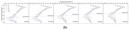 Figure 6 illustrates the maximum bending moment of the HRPG at different embedment depths. In this context, “9 m” denotes a 9 m embedment of the offshore wind turbine high-raise pile foundation, whereas “Pp” and “Np” refer to positive and negative batter piles, respectively. Absolute values are employed for comparison. The figure is organized into two rows—one for “Pp” and one for “Np”—and five columns corresponding to embedment depths of 9, 12, 15, 18, and 21 m.