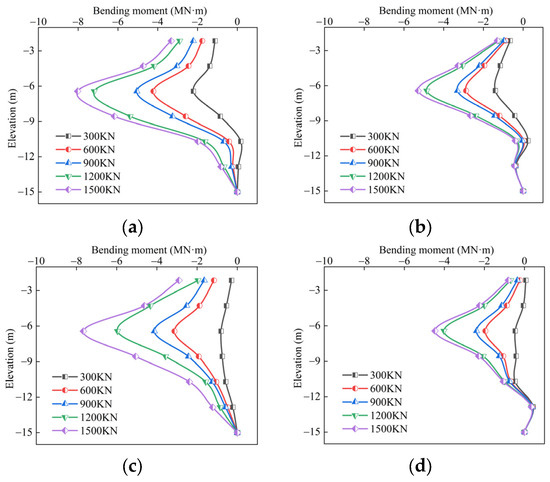 Bending moment of HRPG under different lateral loads: (a) 15m0 (Pp); (b) 15m8 (Pp); (c) 15m0 (Np); (d) 15m8 (Np).